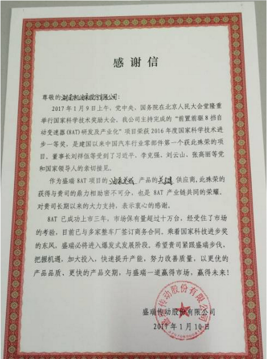 盛瑞公司感謝信