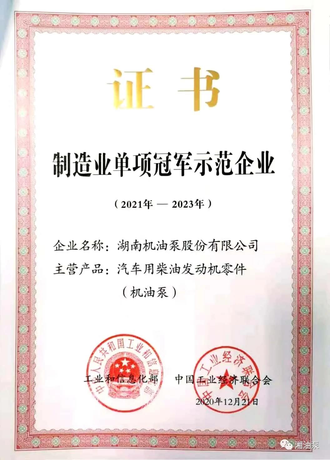 湖南機(jī)油泵股份有限公司被授予制造業(yè)單項(xiàng)冠軍示范企業(yè)